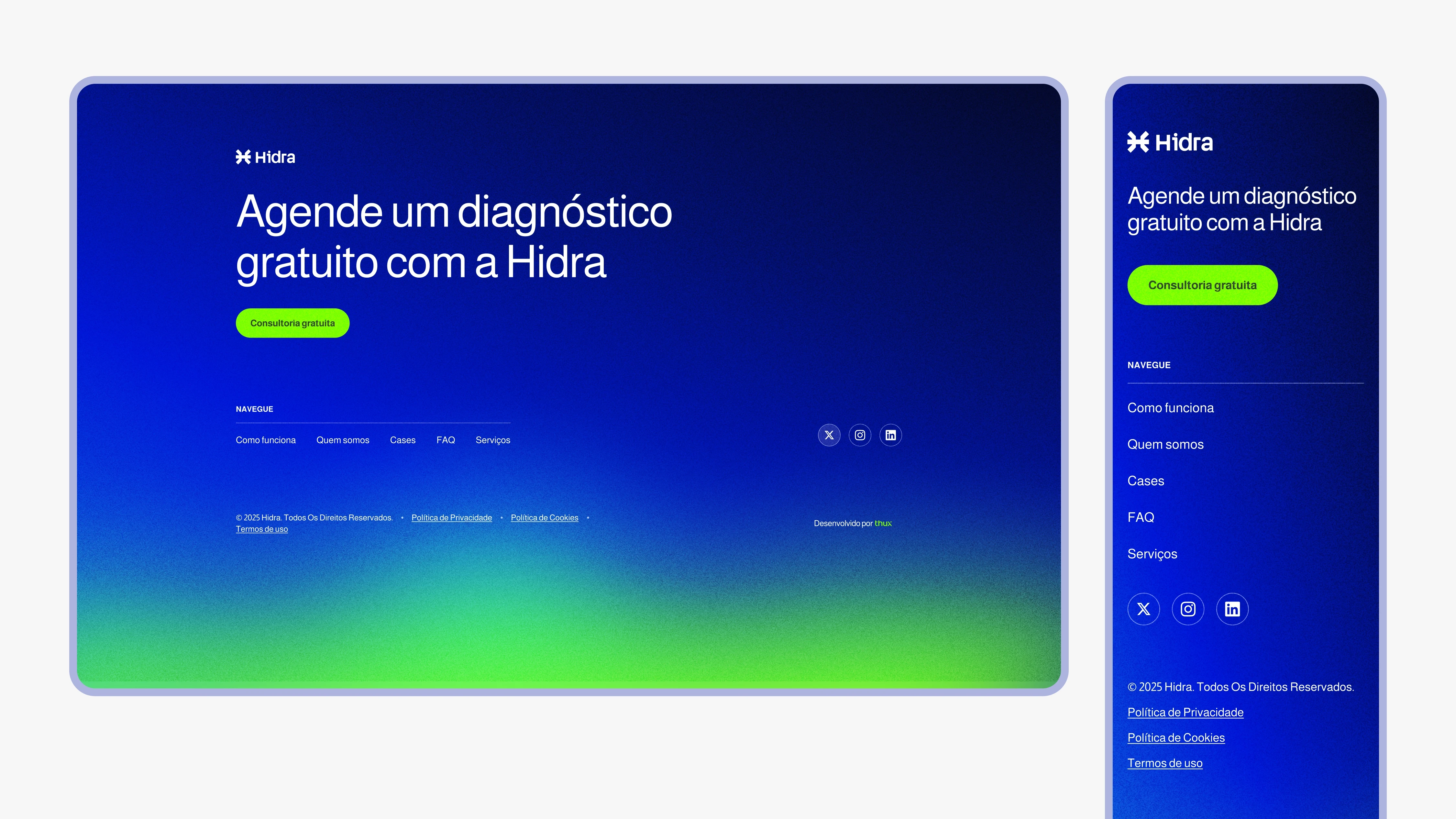 O projeto da Hidra Software foi desenvolvido em colaboração com o estúdio de UX Thux. Atuei 100% na criação do design (desde os primeiros wireframes até a aprovação do layout final) e no desenvolvimento e lançamento do projeto, construindo todas as animações e funcionalidades finais.